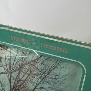A vintage framed print titled "Memories of Yesteryear", featuring a charming scene with a couple in an old-fashioned car and a covered bridge in the background. The print is encased in a green frame, adding to its nostalgic appeal. The print showcases an advertisement for Bill Halverson Implements, a J.I. Case Implements dealer in DeKalb, Illinois, advertising Wisconsin Engines, New Holland Farm Machinery, Fox Cutters, and John Bean Sprayers, adding a unique historical touch to the piece. This print is a lovely decorative item, ideal for collectors of vintage advertising or anyone who appreciates historical artwork.