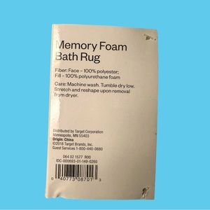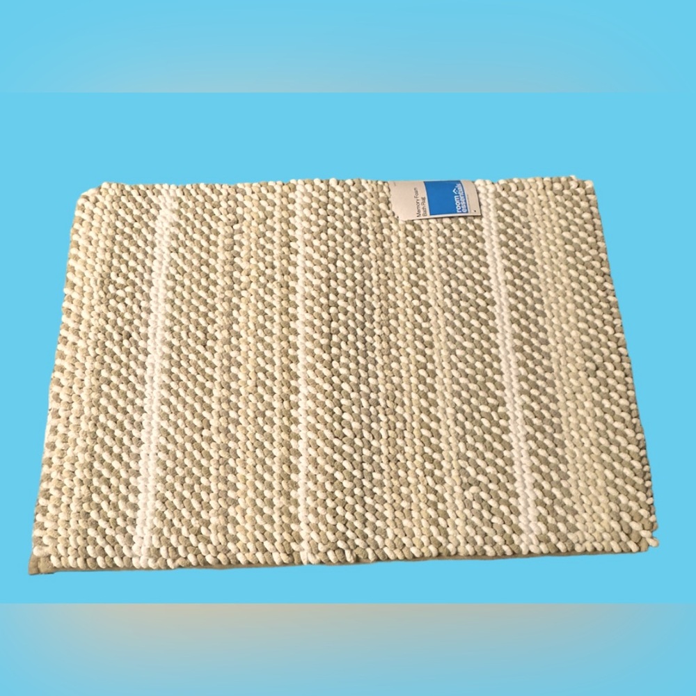 Brand new with tags memory foam bath rug. Beige and white color bath rug. Room Essentials brand bath rug. Size: 17” by 24” ( 43.1 cm by 60.9 cm ). Memory foam bath rug made out of Fiber: face- 100% polyester and fill- 100% polyurethane foam.