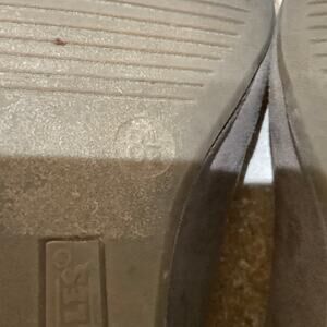 These Memory Foam Seychelles heels are crafted for both style and comfort. They feature a sophisticated brown-grey suede exterior with a pleated design on the toe, adding a touch of elegance to any outfit. The memory foam insole ensures a cushioned step, perfect for all-day wear.