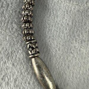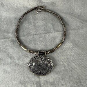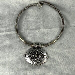 Memory Wire Silver-Tone Choker Length Necklace Ornate Oval Pendant Beaded Accents, Unbranded, Patina of Aging on Silver-Tone Beading.