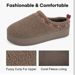 Brand new brown fuzzy curly fur platform memory foam slippers with a 1.4” lightweight anti slip sole and cute embroidery design. Super cozy!