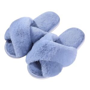 Fuzzy open-toe faux fur slippers. The slippers are made from a light and breathable material and have a memory foam sole.