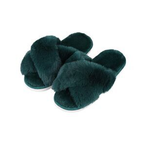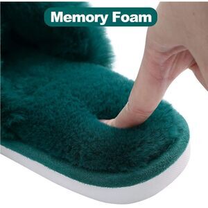 Fuzzy open-toe faux fur slippers. The slippers are made from a light and breathable material and have a memory foam sole.