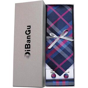 🆕Men Blue Plaid Silk Checkered Necktie Pocket Square Cufflinks Tie Clip Set
