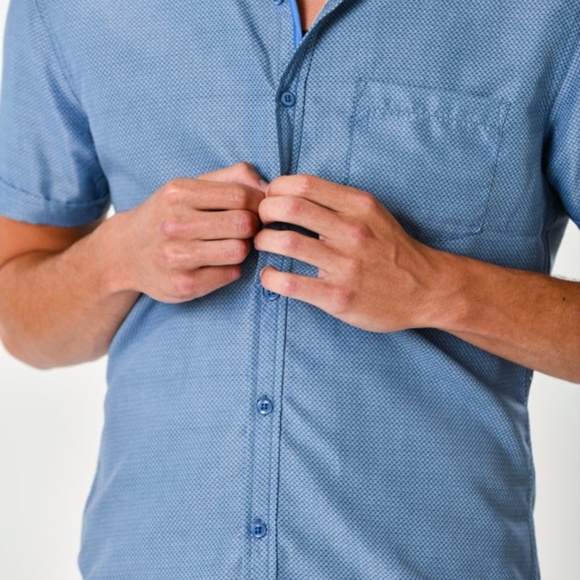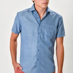 This short sleeve button down is a dressy trendy top for guys! This can be dressed up or down. This product is a tailored fit and it is super comfortable!!
