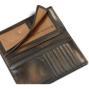 Pedal To The Metal… Jack’s Skull Long Bifold Wallet is the Ultimate in Attitude. Whether biker, rocker or hard core persona, this full sized Long Wallet offers an organized interior with full-length bill compartments and multiple card slots. Designed with quality craftsmanship and burnished by hand, this Skull Tall Wallet will develop a rich patina with time and use. Check out the "regret nothing" screen print in the cash slide.