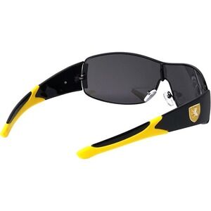 Sleek shield sunglasses that deliver a modern, sporty edge. These sunglasses feature a bold black frame accented with vibrant yellow detailing, creating a striking contrast. The wraparound design offers excellent coverage and a secure fit, perfect for active lifestyles. A subtle emblem adds a touch of distinction without overpowering the overall aesthetic. Ideal for driving, outdoor sports, or casual sunny day outings.