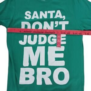 Festive green Christmas tee with bold white lettering that reads “Santa, Don’t Judge Me Bro.” Men’s/Unisex size Medium, 100% cotton, made in Haiti. A hilarious choice for ugly sweater parties, holiday gatherings, or casual festive wear. Great gift idea for someone with a sense of humor. Good preowned condition.