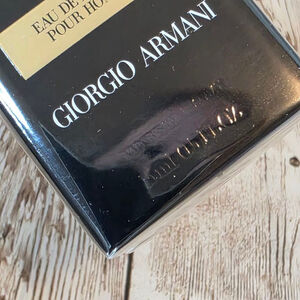 This is a new, unused Giorgio Armani Code for men, without its original tags. The bottle is encased in a black and gold box, with the brand and product name clearly displayed. The box is sealed in plastic. The box is in excellent condition, with no visible scratches or dents.