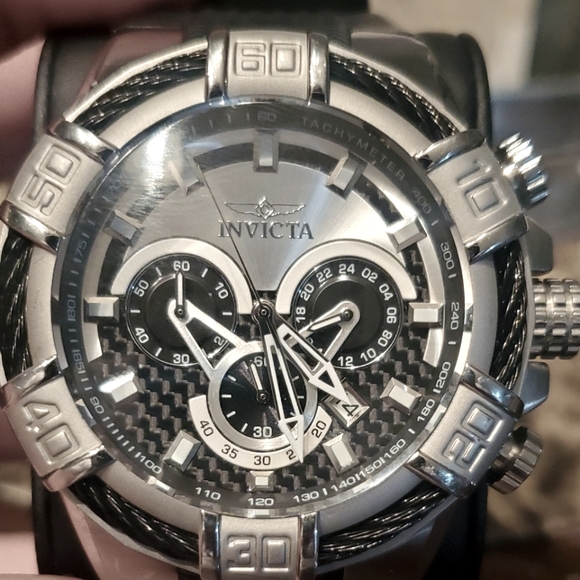 Pre owned Invicta bolt 50mm. Black rubber strap.;Silver and black carbon fiber dial.Good condition....