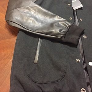Black jacket with leather looking sleeves and details on pockets .. NWT.. Runs really small -- size is L but will comfortably fit S.