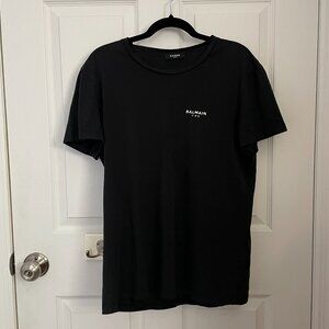 Balmain Flocked Mini Logo T-Shirt, Label Size L. Logo has slight fading. Black Color. MSRP 400