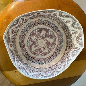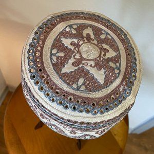 Blue and maroon embroidered Muslim worship hat. No size tag attached, measurement is 6 inches across the top.