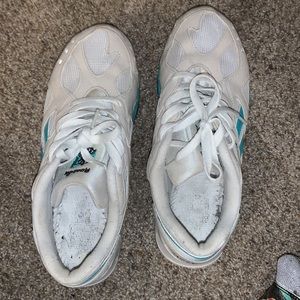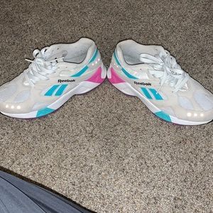 Men Reeboks ok condition pinkish :purple/turquoise color on white no insole