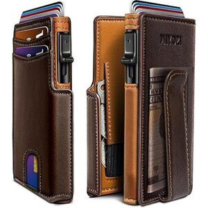 🧿POWERFUL CAPACITY--Slim smart wallet with refined layout to fit in front pocket,easy for 9 cards 5 coins&keys and couple of bills--5 cards in the aluminum case with pop-up access, 4 cards in the leather shell;