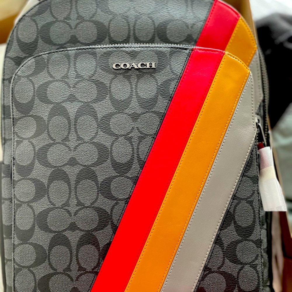 Signature coated and smooth calf leather. Insides zip and multifunction pockets. Inside laptop sleeve. Zip closure, fabric lining. Top handle with 2” drop. Outside pocket. Adjustable shoulder straps. And on the size it’s between Medium and Large.