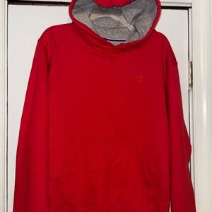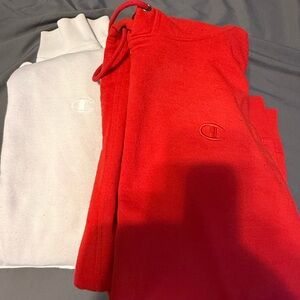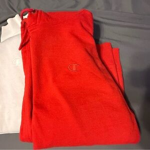 Vibrant red hoody , white hoody. and navy joggers by Champion. Ideal for active days. Red small. White medium. Medium joggers