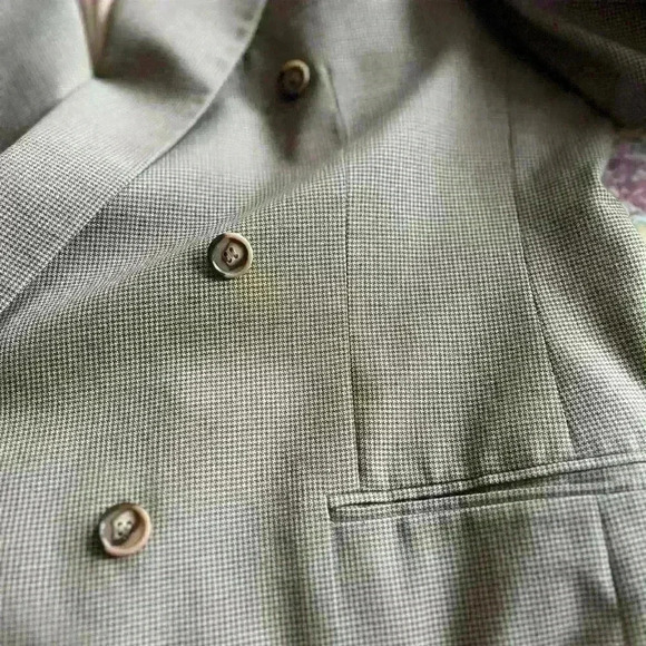 Men tan and green checkered suit. In good condition measurements sleeve 24 inches long armpit to armpit 22 inches nape of neck to bottom of suit 32 inches. Pants length 44 inches inseam 32 inches waist 38 inches.