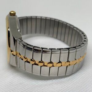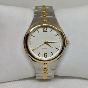 Men classic gold silver tone watch 38mm round case quartz analog stretch band size 7.5” , in good condition