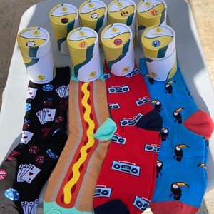 6 Different pattern with eight pairs left. Container holds.your socks. Crew length and brilliant colors