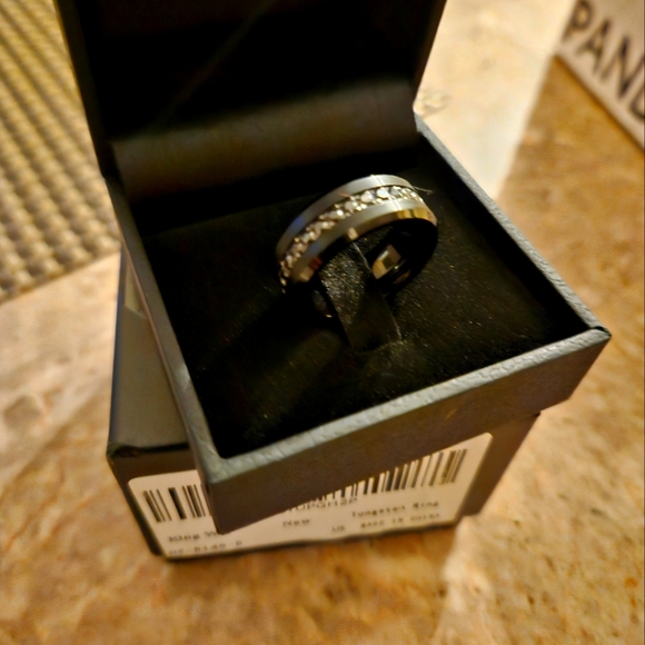 Tungsten Carbide beveled ring with cubic zirconia stones. Men size 8, still in the box.