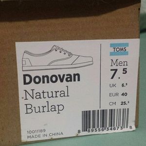 Men's Toms,beige color. Worn once. Style of shoe allows it to be worm with or without laces. Leather backing. Casual Donovan,great quality shoe.
