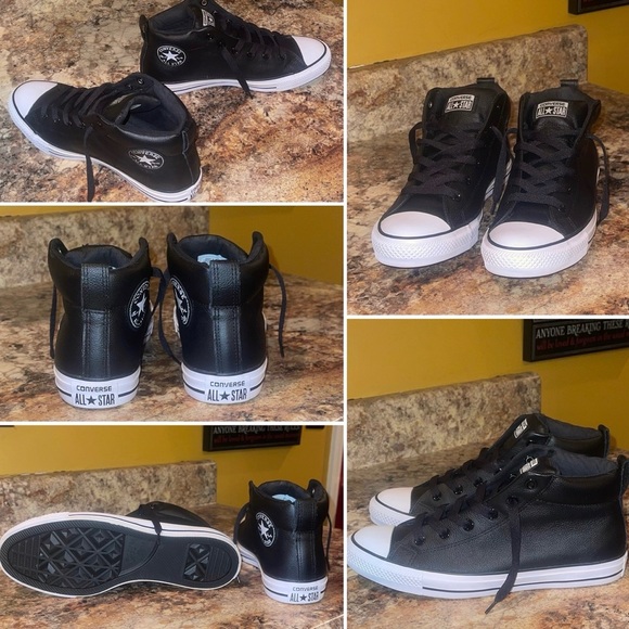 Classic leather high-top design. Black canvas with black soles. Signature Converse All Star logo on the side.