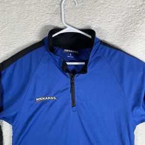 The Menards 1/4 Zip Shirt is a blue pullover designed for male employees in size large. Made of polyester, this shirt serves as a work uniform for sales clerks at Menards retail stores. The quarter-zip design offers ease of wear and a professional look, suitable for those working in the retail industry.