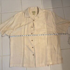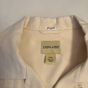 Offered is a Joseph and Feiss 100% silk collared casual/dress shirt - size XXL. There is a subtle pattern of palm tree leaves on the shirt. This shirt is 100% silk and has always been dry cleaned. It is in excellent condition.