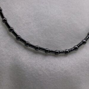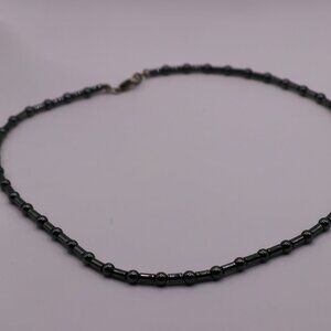This high quality glossy hematite gemstone necklace is 16" long and in very good condition. The beads alternate between round and cylindrical beads, finished with a lobster-style closure.