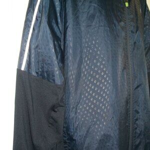This jacket is pre-owned but has been worn very little. It is still in very good condition. It has reflective accents to maximize safety for night jogs/runs, etc.