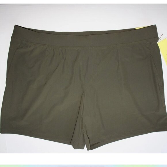 Men's All In Motion olive green workout stretch shorts with drawstring waist, secure zippered back pocket. Size XXL, waist is 44" - 54", length is 17". Fabric is a polyester blend.