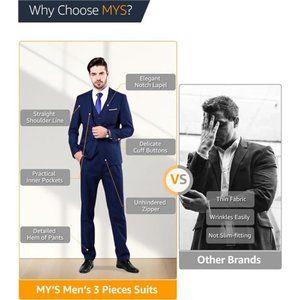*Exceptional Quality and Craftsmanship: At MY’S, we prioritize top-tier quality by using premium materials and meticulous craftsmanship in our men's suits and tuxedos. Our fabric exceeds industry standards with 30% improved durability and breathability. Enhanced comfort is assured through larger shoulder pads and chest linings. Through an extensive process involving over 300 steps, our suits epitomize the high standards shown in our visuals, ensuring exceptional quality in every detail.