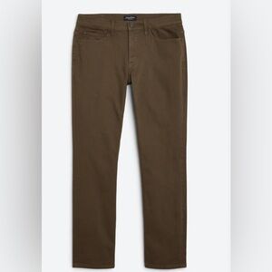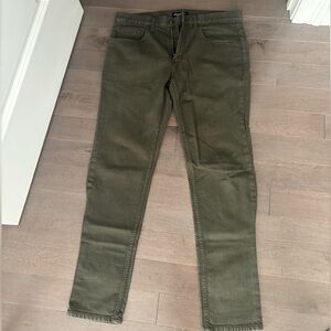 Flag & Anthem's Oakland Slim Straight Fit Stretch Jeans. These jeans have a slim fit through the entire leg for a sleek look, while the durable fabric and great stretch make them comfy to wear. Color is a dark olive green. Men's size 31/30.