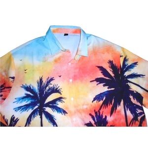 Vibrant casual shirt with palm tree design. Features a sunset color palette. Perfect for beach outings.