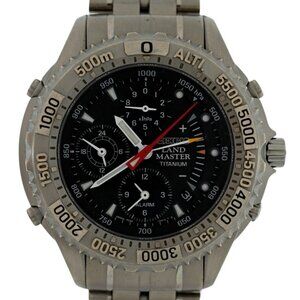 Features: Black dial, altimeter bidirectional bezel, Japan made quartz movement, luminous hands and hour indicators, water resistant, date indicator, 24 hour hand, and an alarm