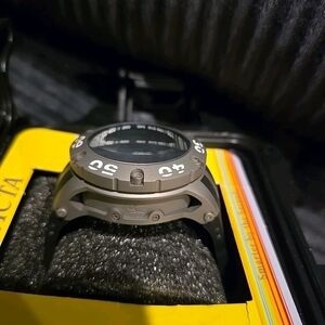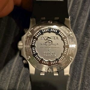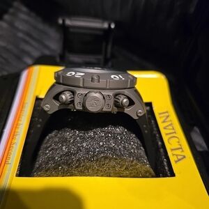 Titanium case with a rubber strap. Unidirectional titanium bezel. Black dial with skeletal hands and index hour markers. Minute markers. tachymeter scale appears around the outer rim. Dial Type: Analog. Luminescent hands and markers. Date display appears between the 4 and 5 o'clock position. Chronograph - three sub-dials displaying: 60 second, 30 minute and 1/10th of a second. Quartz movement. Scratch resistant flame fusion crystal. Solid case back. Case diameter: 52 mm. Case thickness: 20 mm. Round case shape. Band width: 30 mm. Tang clasp. Water resistant at 500 meters/ 1650 feet. Functions: hours, minutes, seconds, date, chronograph, tachymeter. Sport watch style. Watch label: Swiss Made. Invicta Reserve Specialty Black Chronograph Dial Men's Watch 0920.