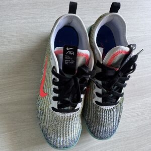 Dynamic Nike Air sneakers with a knit design. Features vibrant pink, green, and black details.