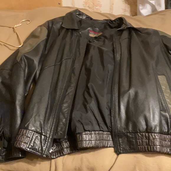 Leather jacket dark green triangle goes down from shoulders