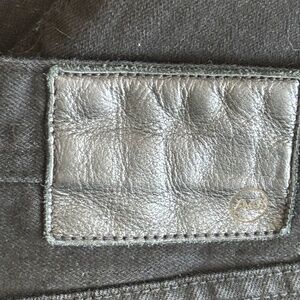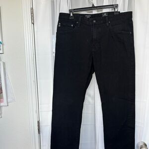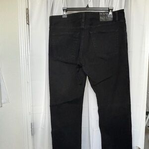 Tapered leg openings bring a modern, tailored look to stretchy straight-leg jeans aged with lived-in fading 34x32