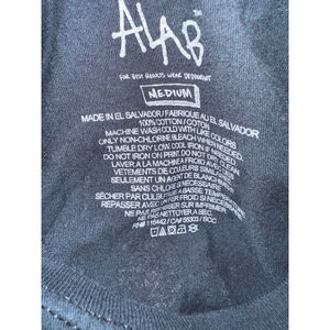 This is a pre-owned, medium-sized, black Alab T-shirt made of 100% cotton. The front features a small graphic of a mushroom with a snail on top. The back has a larger graphic of multiple mushrooms and a snail. The shirt measures approximately 18 inches from armpit to armpit and 28 inches in length. There are no visible stains or tears.