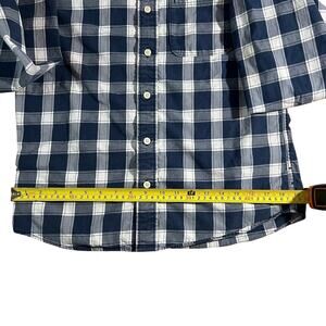 Classic navy & white plaid button down from Abercrombie & Fitch. Muscle Fit (slim through chest/arms). Long sleeve, chest pocket, button front, curved hem. 100% Cotton. Size Large.