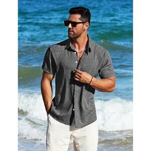Men's A-dark Grey Linen Short Sleeve Button Down Casual Shirt Business Dress