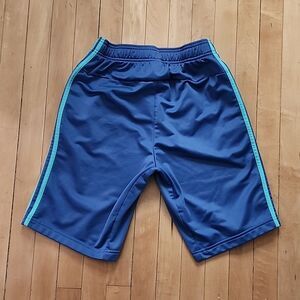 Men's Adidas shorts size small. The shorts are blue with turquoise stripes. They have two side zipper pockets and drawstring waist. These are in excellent condition.