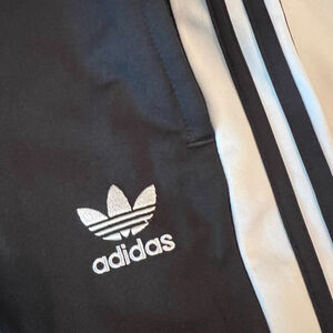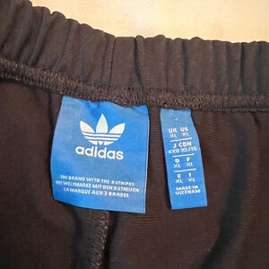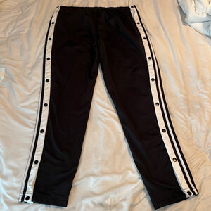 These are black Adidas track pants with white stripes down the sides. They have a button sides and a drawstring waist. The size is XL. The waist is 30 inches and the inseam is 17 inches.