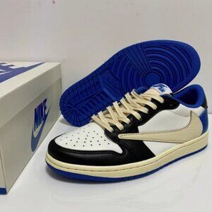 Elevate your sneaker collection with the Men's Air Jordan 1 Low Fragment x Travis Scott! This collaborative masterpiece features a striking mix of black, white, and blue, with signature details like the Fragment lightning bolt and Travis Scott's brand elements. The design blends iconic Air Jordan heritage with avant-garde streetwear flair.