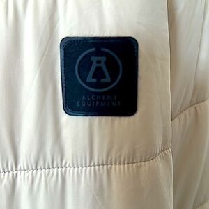 Men's Alchemy Equipment Insulated Jacket! Excellent Condition! Worn maybe twice. Light Tan with Dark Navy/Black Trim Lightweight so can be rolled for travel Working Zippers on outside with 1 Zippered Pocket on the Inside Water Repellent Finish Primaloft Black Eco Insulation Small snag on the back -Please see last picture Size-L Color- Light Tan Measurements laying flat- Pit to pit-24" Top of back collar to hem- 30" approx.