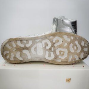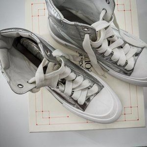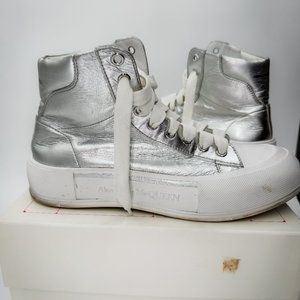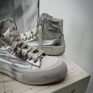 Metallic leather lends an exciting feel to these high-top platform sneakers by Alexander McQueen.