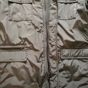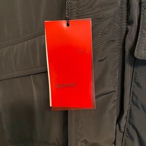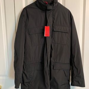 Men’s Alfani fitted black lined jacket, size large, with snap closure and zipper. 100% polyester. Many pockets on outside and inside. Jacket measures approximately 23” wide and 32” long. Never worn and comes from a smoke free home.