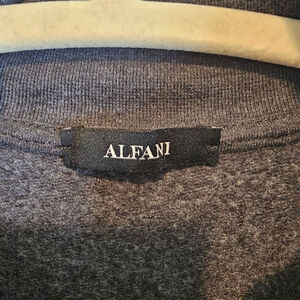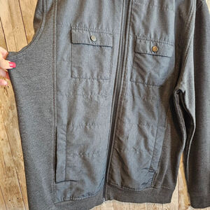 This is a pre-owned men's Aleani size L jacket. It is a dark gray color with a quilted front panel and a fleece back. The jacket has a zipper closure and two flap pockets with button closures on the front. The sleeves are long and have a ribbed cuff. The jacket is in like new condition. The jacket was made in Egypt.